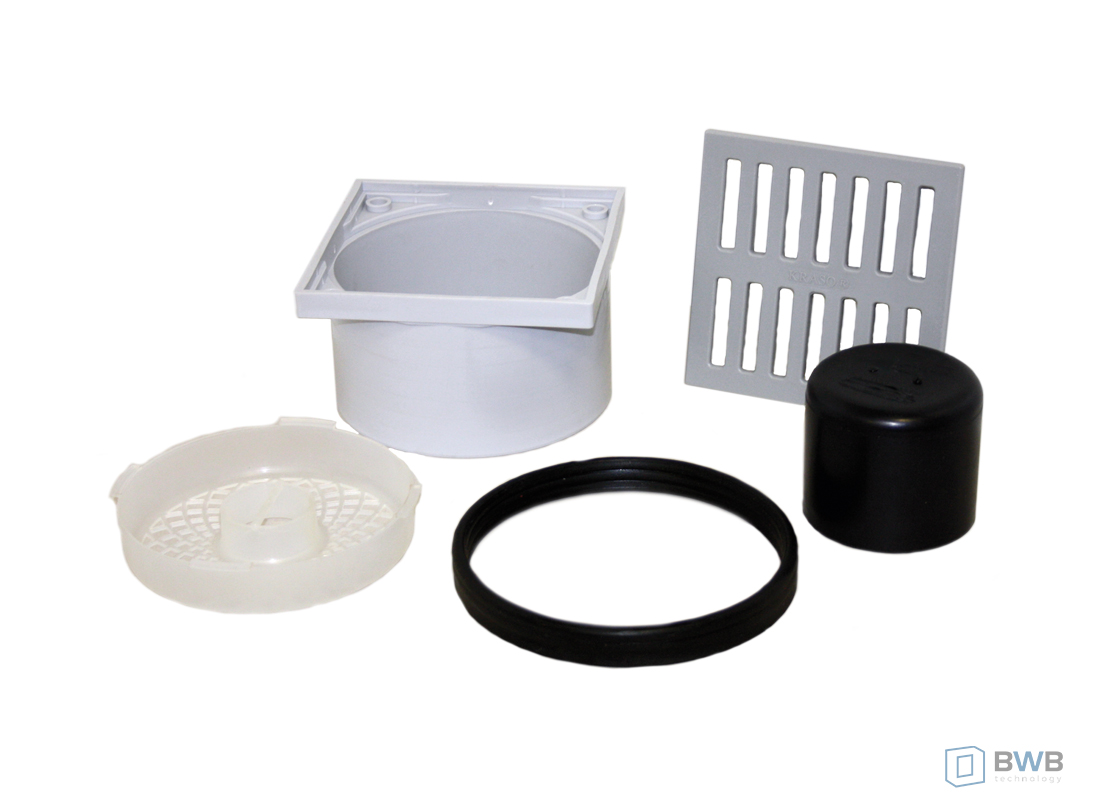 | Zestaw części zapasowych | zestaw składający się z uszczelki zabezpieczającej przed cofaniem się wody, klosza blokującego zapachy, sita do wyłapywania szlamu, ramy i kratki z tworzywa sztucznego |